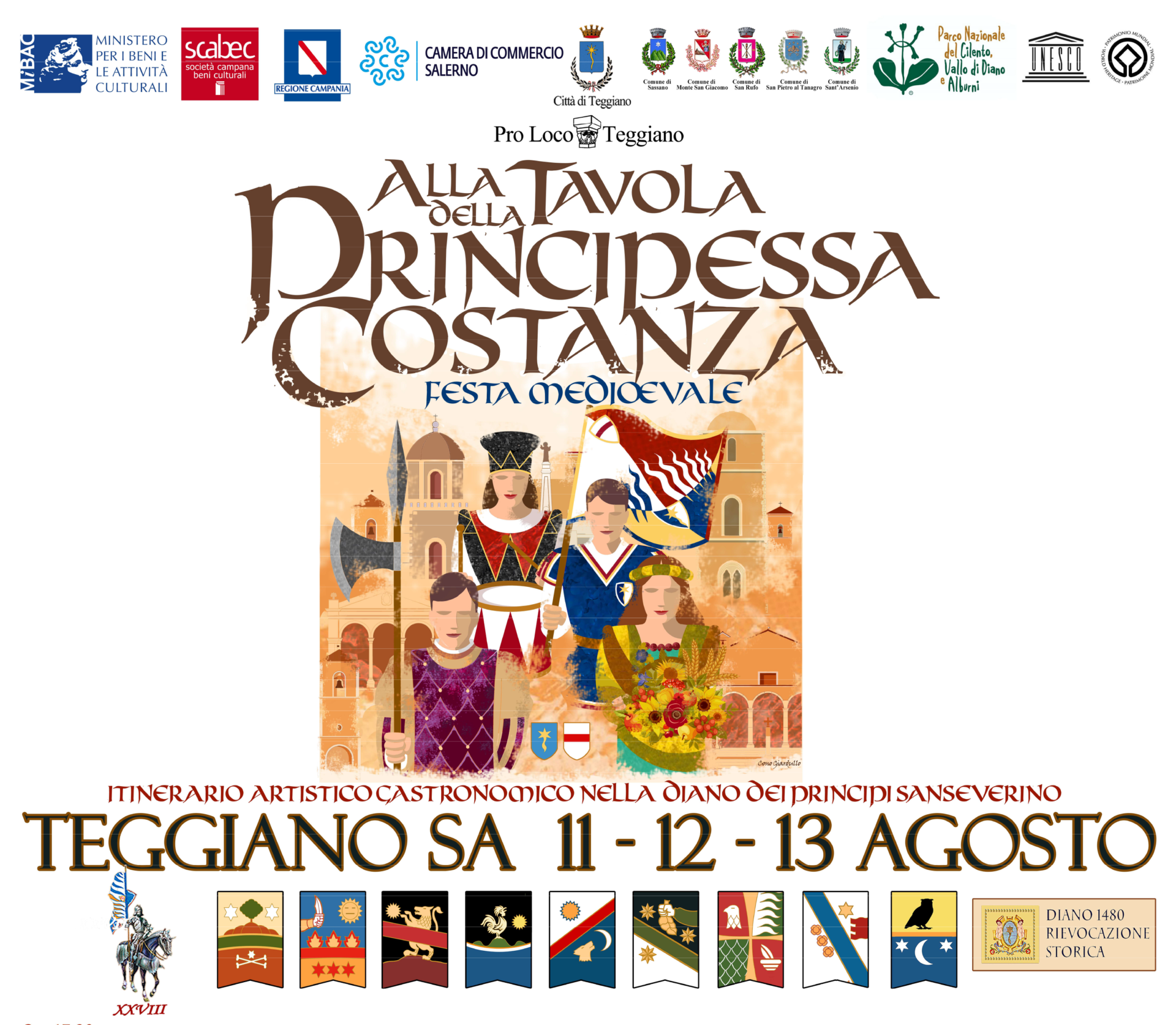 Ogni giorno, per 3 giorni, ovvero l’11, il 12 e il 13 agosto, il grande Corteo Storico partirà dal Castello Macchiaroli dando il via all’evento, che vedrà il borgo di Teggiano trasformarsi in una macchina del tempo che rievocherà arti, mestieri, piatti, spettacoli ed emozioni del 1480, quando la Principessa Costanza da Montefeltro sposò il Principe Antonello Sanseverino: per l’occasione, la cittadina campana celebrò il matrimonio con canti e feste che oggi vengono rievocate attraverso l’evento.