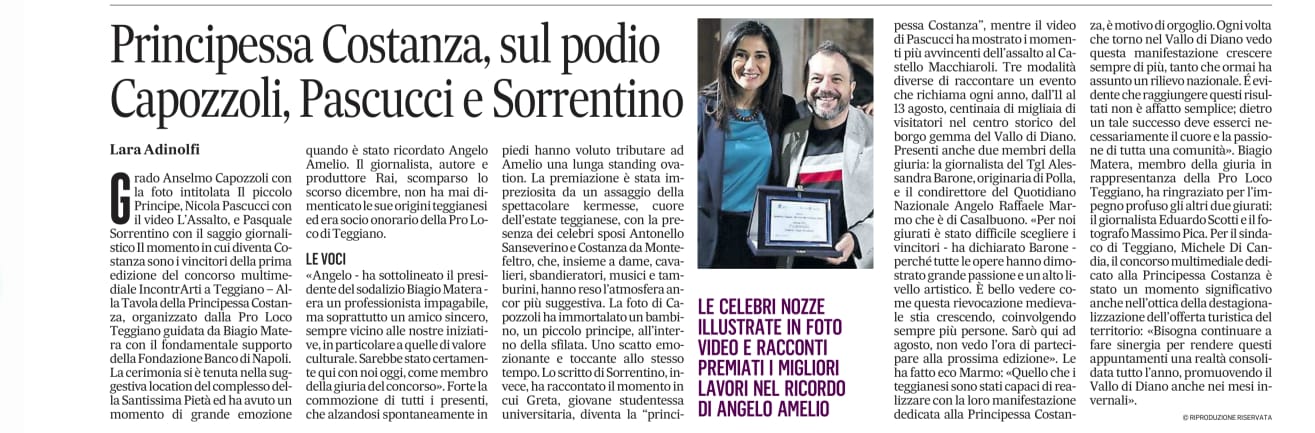 Il prestigioso quotidiano Il Mattino di Salerno ha dedicato spazio alla cerimonia di premiazione della prima edizione del Concorso Multimediale “IncontrArti a Teggiano – Alla Tavola della Principessa Costanza”, sottolineando il successo dell’iniziativa e l’emozione vissuta durante l’evento. Un riconoscimento importante che valorizza l’impegno culturale della nostra comunità.