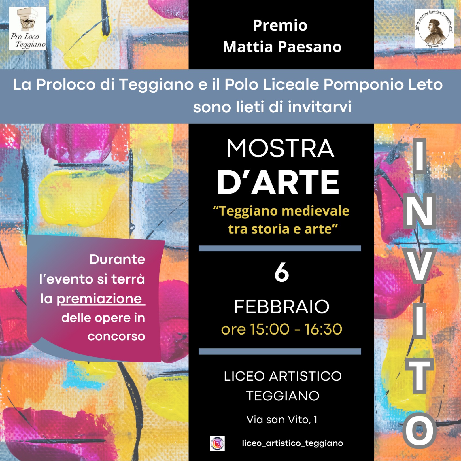 Teggiano si prepara ad accogliere la prima edizione del Premio Mattia Paesano, iniziativa voluta dalla Pro Loco Teggiano in collaborazione con il Liceo Artistico Pomponio Leto, per rendere omaggio alla memoria di Mattia Paesano, un giovane del territorio prematuramente scomparso. L’evento si terrà il prossimo 6 febbraio presso il Liceo Artistico di Teggiano, dalle ore 15:00 alle 16:30, e sarà l’occasione per premiare le opere artistiche realizzate dagli studenti in concorso.
